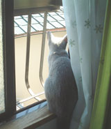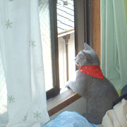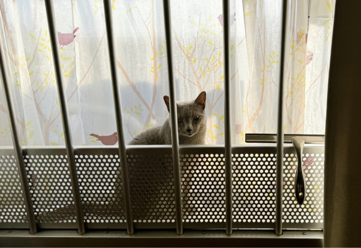 朝のさくらさんの定位置。日なたぼっこが好き。 逆光でシルエットになっているのも灰色猫の小悪魔感が出ていて、いい感じ。 -