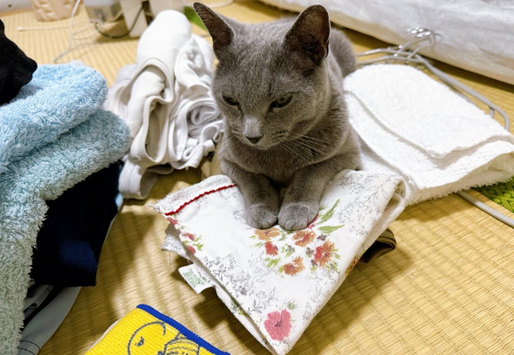 猫あるある: 洗濯をたたむと乗る