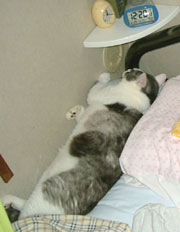人間(わたし)のベッドに眠る、文太。すっかりここが定位置。 朝起きるとこんなのが顔の横に ドテッ=3といるのです・・・いびきをかいたり、ムニャムニャ言ったりする... -