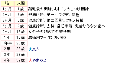 猫の年齢の数え方。をWEBで見つけました じゃぁ、これによると やきちよさんは今の私の年齢を超えるところ。 子猫のときから一緒なのに、やきちよさんはあっという間に... -