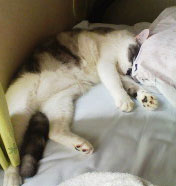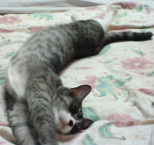 やきちよ&文太の最後の子どもたち、2組めの双子:もんど(兄)&さくら(妹)のお誕生日です。おめでとう!! 写真は、さくらの寝姿♪♪兄3匹は、みんなデカデカ巨体ネコ... -