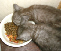火曜日ごろ。こねこたち、文太のごはんに顔をつっこんでパリパリ。なので離乳期用フードを買ってきました。 てことは、トイレも開始です。 -