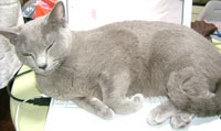 グレーの毛色を「Blue」と言うとおり。ロシアンブルーの被毛の、生え際&地肌などはほんとに青っぽい灰色をしています。 やきちよさんが眠そうに目をふせると、まぶ... -